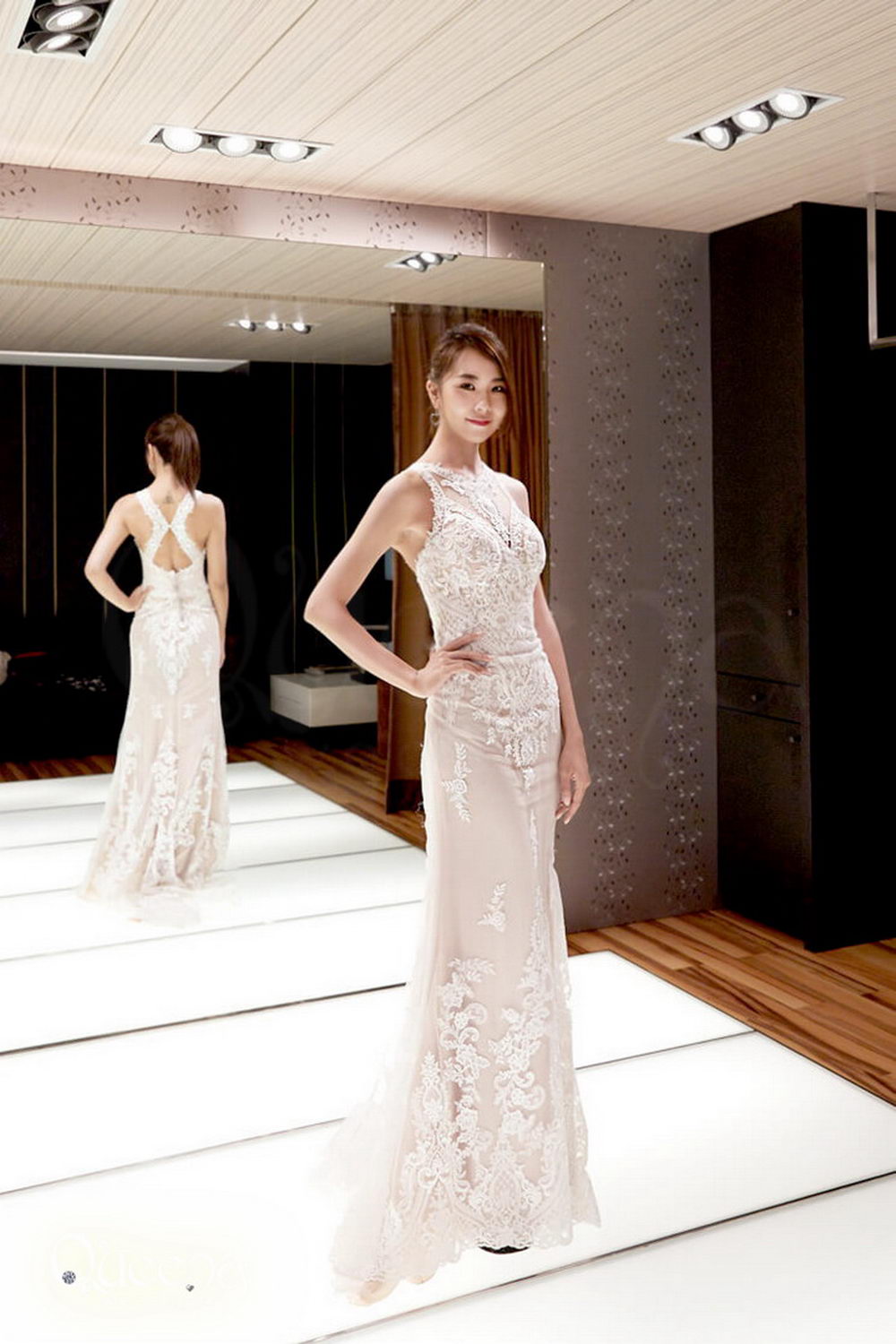第一套試穿的禮服是來自紐約的Demetrios的魚尾刺繡款,精緻的蕾絲與手工刺繡以及合身的立體剪裁是這件禮服的經典所在,擅長透析歐美與東方女性身材,專為東方女性曲線訂做打版剪裁根基,遂成為了亞洲夢幻架纱的指標品牌。這套禮服充分展現該品牌的立體剪裁功力,將女性身體曲線的美表露無疑,而我非常喜歡它胸前透膚的刺繡與背後交叉的設計,整體感看起來輕盈自在又不失莊重。