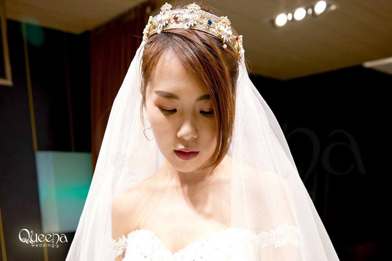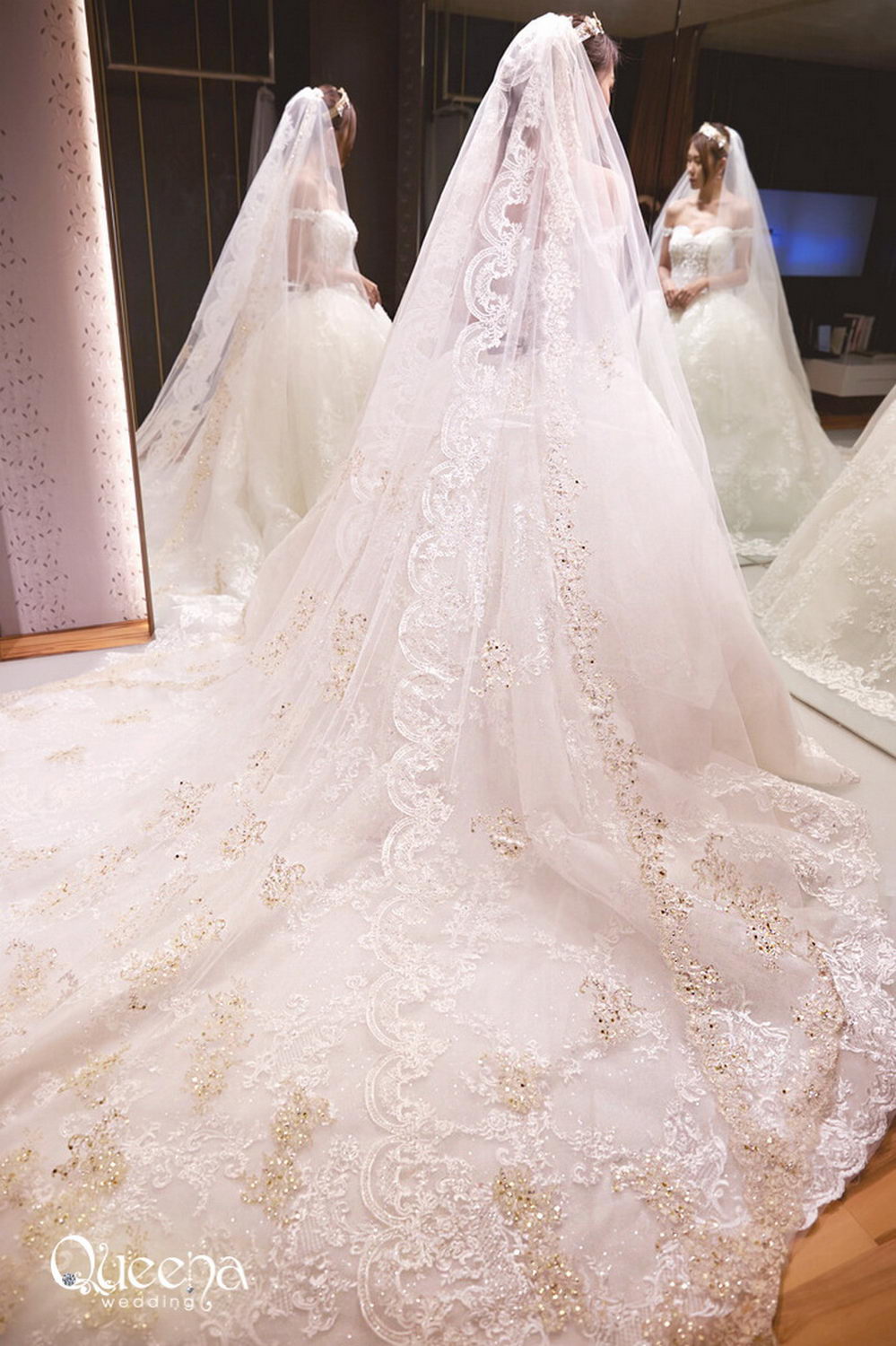 除此之外,昆娜也替每套婚紗搭配了專屬的頭飾與首飾,再加掛上極具裝飾性的頭紗,整個氣場超強大。