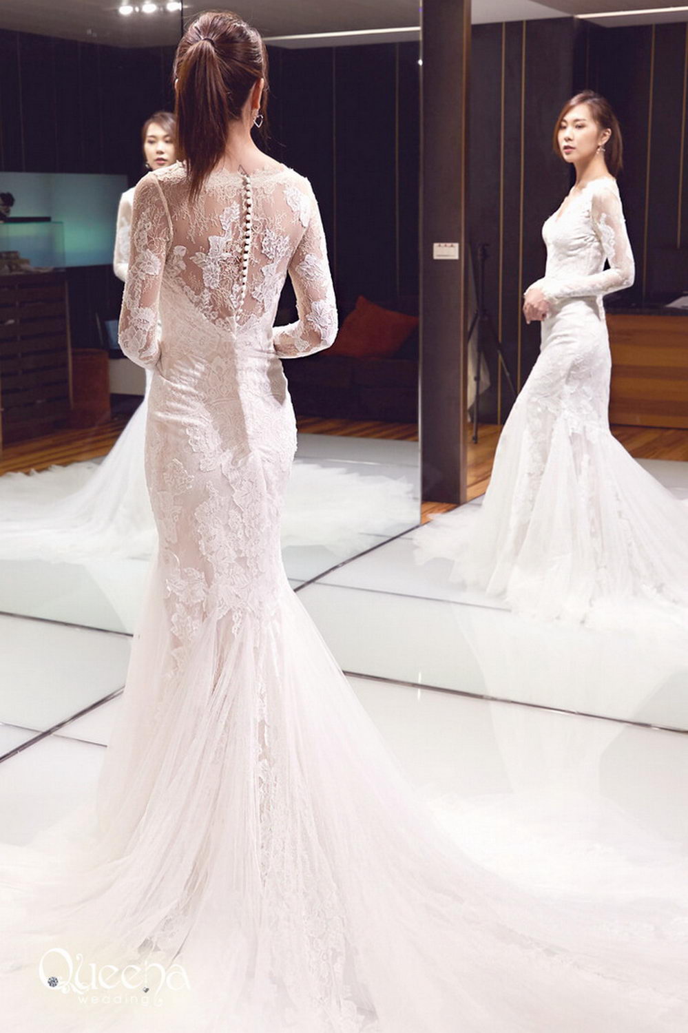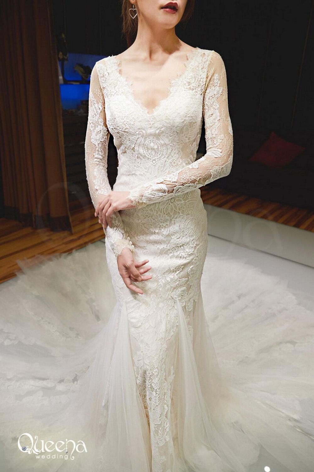 ▽ 超級精緻且少見的蕾絲設計 婚紗,整體延伸覆蓋到V領的位置。