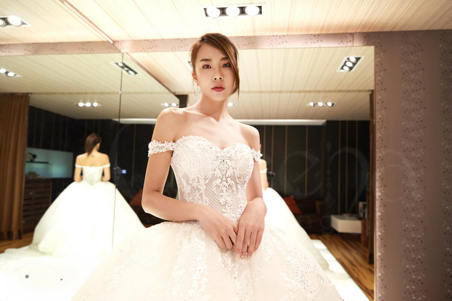 這次我試穿的都是宴客禮服,其中包含美國紐約的設計品牌Demetrios、西班牙皇室御用品牌Pronovias,以及昆娜的自創品牌Camelia。