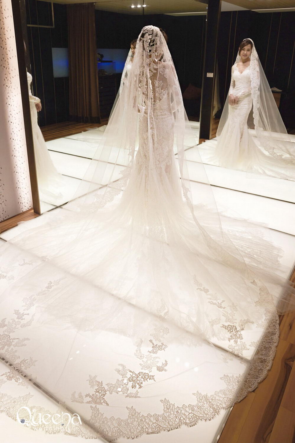 ♡第三套則是來自西班牙的皇室御用品牌婚紗PRONOVIAS,主打是高級專利設計蕾絲,以及優質的絲綢面料與刺繡。這套也是修身魚尾的款式,特色在於其細緻的低胸花邊領口、透膚蕾絲手袖以及刺繡與錯紗的魚尾設計,再搭配上同品牌的四尺蕾絲刺繡滾邊頭紗,整個就是優雅到不行。