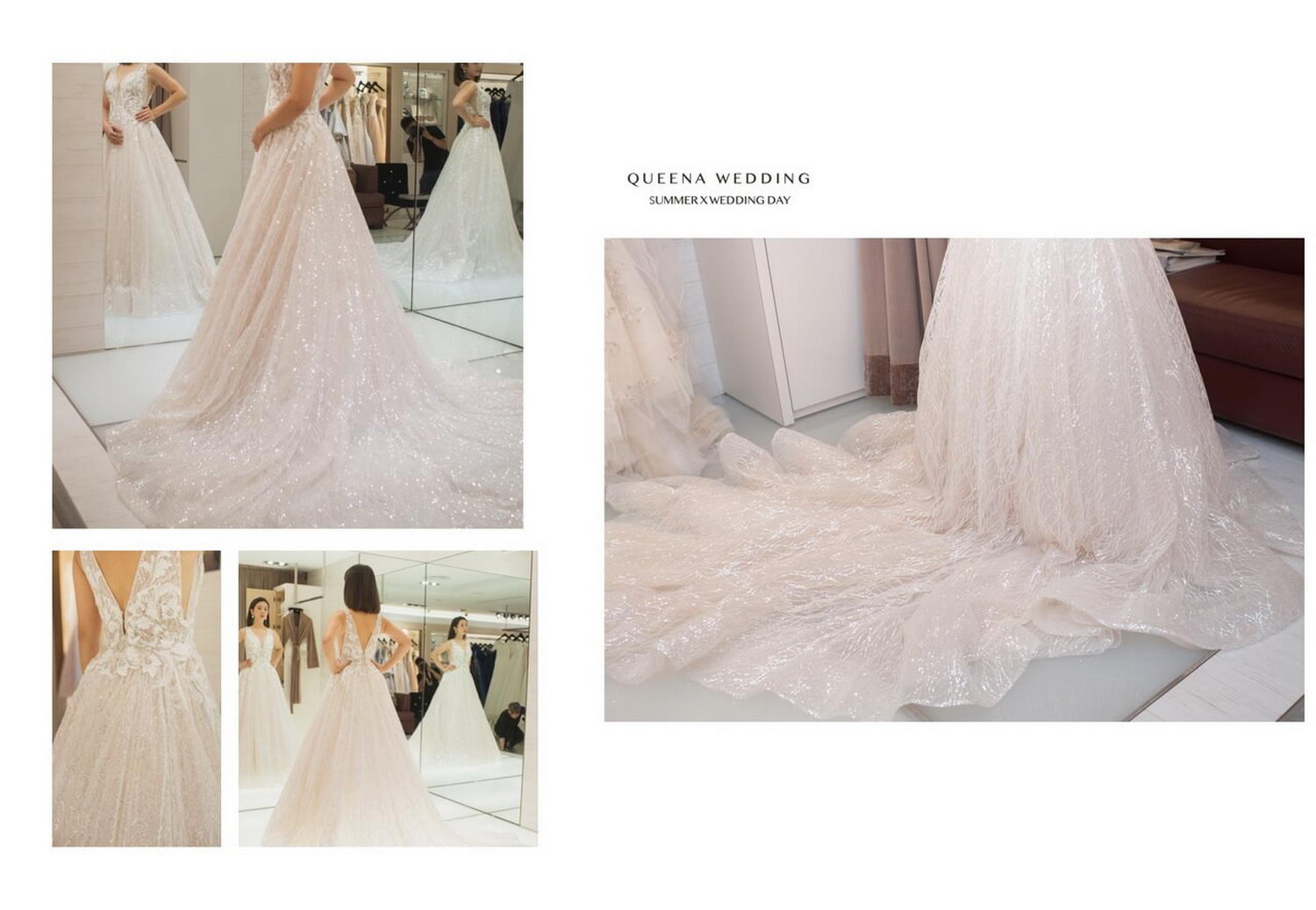 看似微微透亮的婚紗其實是充滿光芒四射的,照片看不太出來它本人帶給我閃亮的感覺,但實際上這件在新娘入場時身上時,發出的光芒讓人不看你也難,怪不得顧問說試穿上的人都會指定要這款,還給我看上海走秀時的美麗影片,整個才能感受到婚禮當天走進紅毯時充滿光芒的巨星感!