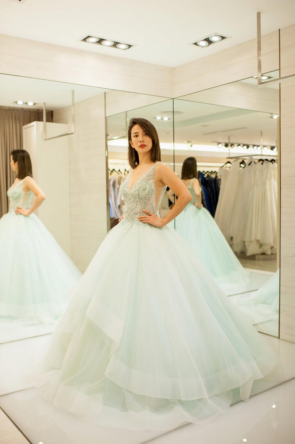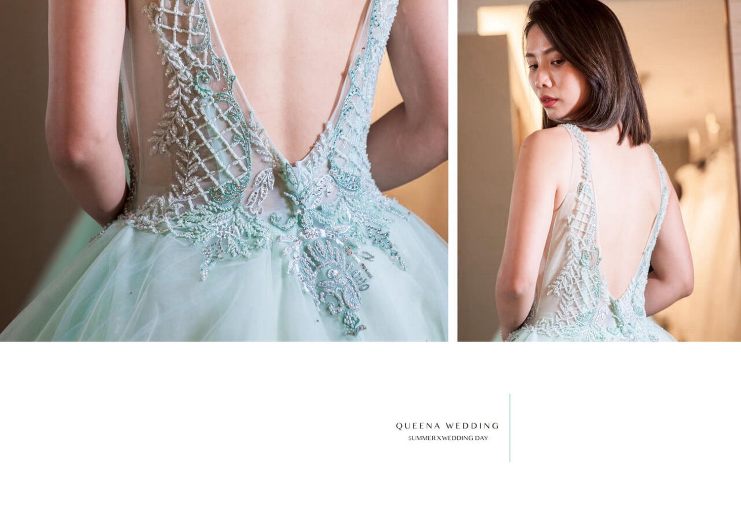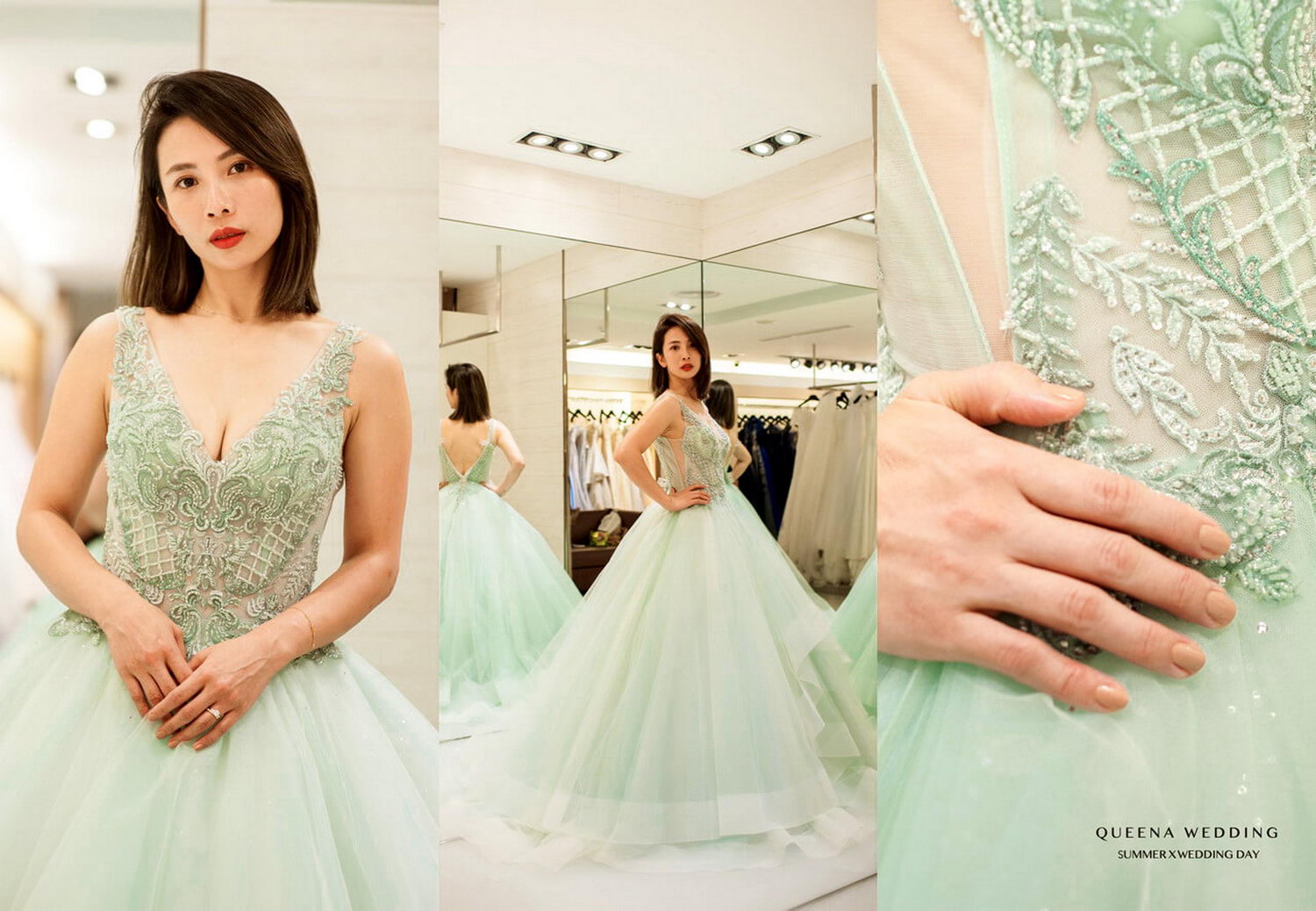 說實話,我本人本來是完全不接受這種綠、粉婚紗,顧問跟我推薦著讓我試試,我抱著是事就看看的心態穿上,邊穿邊問有沒有別的顏色,直到穿好後我對他的剪裁設計讚譽有加,竟然還有種感覺我是小精靈的錯覺,真不愧是台灣設計師設計的款式,最了解我們的身形該如何修飾呈現出最好的,巧妙的把上身的副乳修飾住,讓整個上身看起來更纖細!