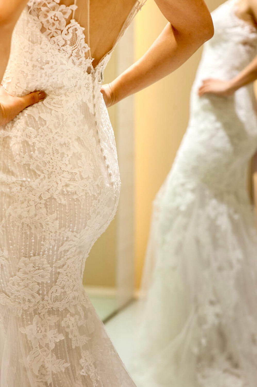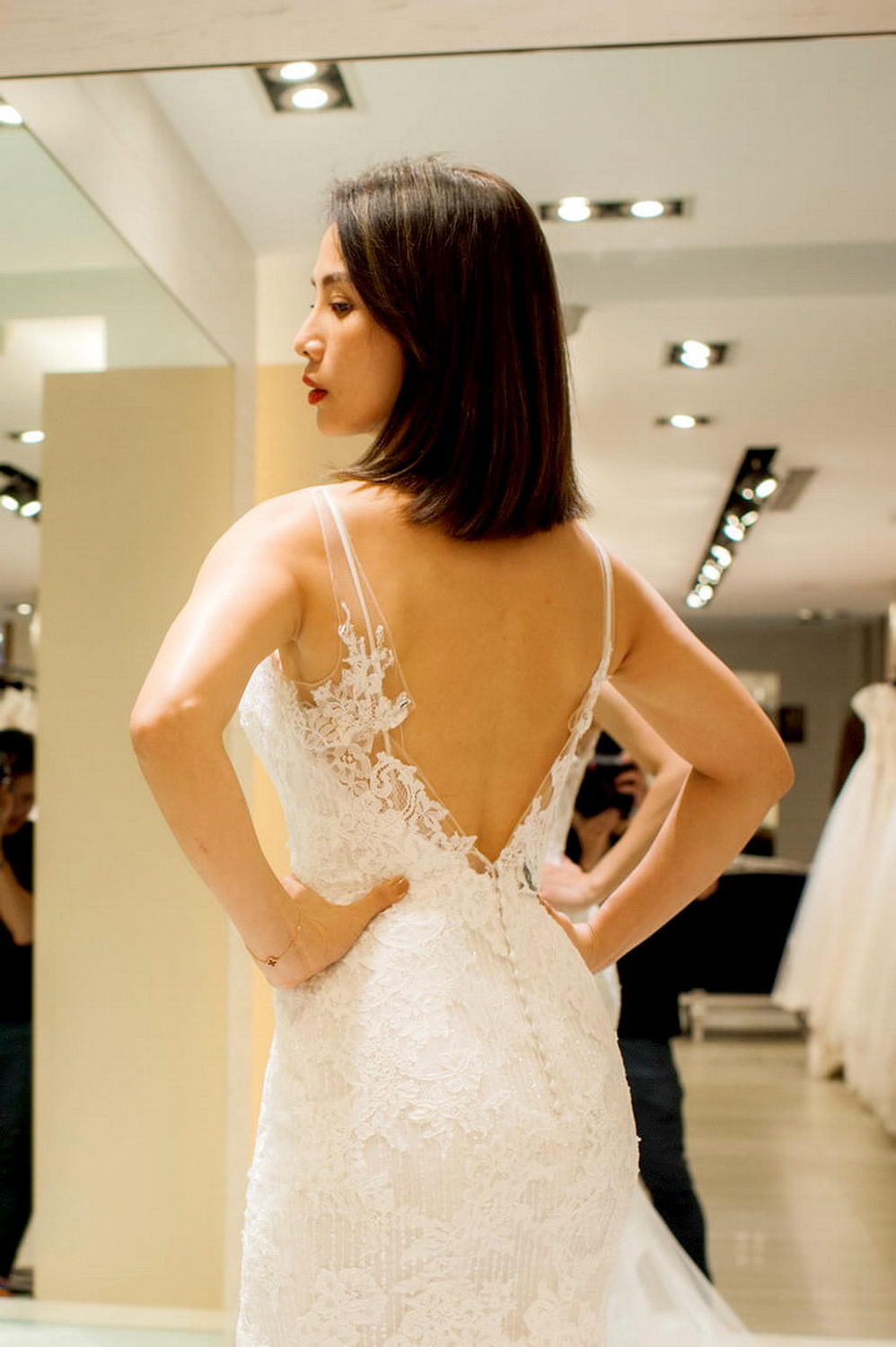 背後是一整排讓我愛到瘋的細細的排扣,而且每顆扣子都很精緻,細看我臀部你會看到低調卻閃亮直條線條,它是藏在蕾絲底下襯托整件魚尾的背後大功臣,利用一件貼身洋裝加上外紗堆疊出的層次感。