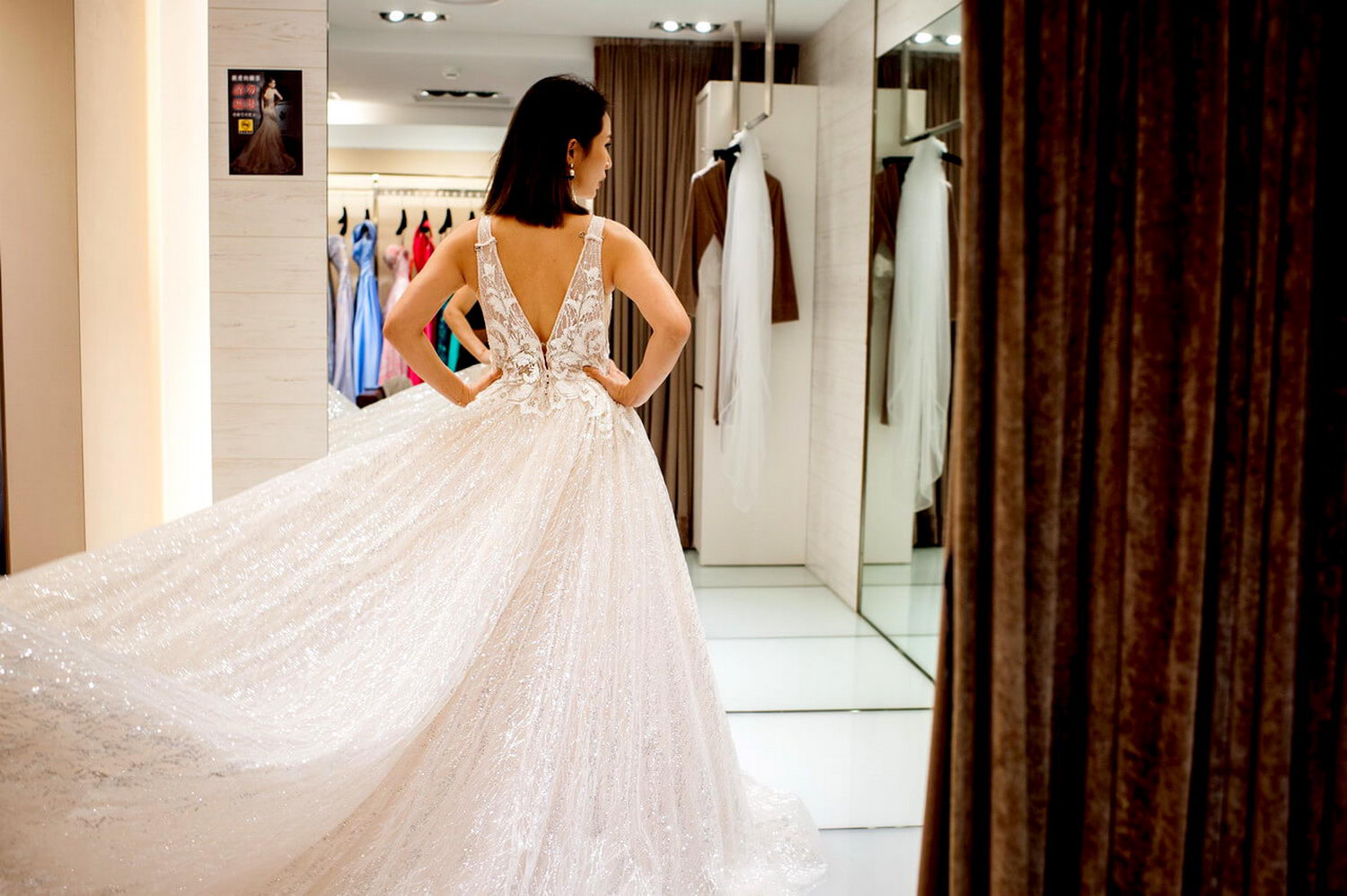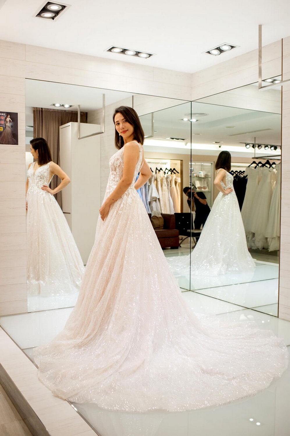 專屬試衣間內底部也有燈,燈全亮看起來很雪白,但燈關掉其實更能看到燈光打在它身上的閃亮而側邊設計是深V開衩到腰,讓你的側腰線看起來更薄,而且透紗的材質跟顏色經過精挑細選,我的膚色算是中等膚色,穿起來遠看幾乎看不太出來是有層紗!