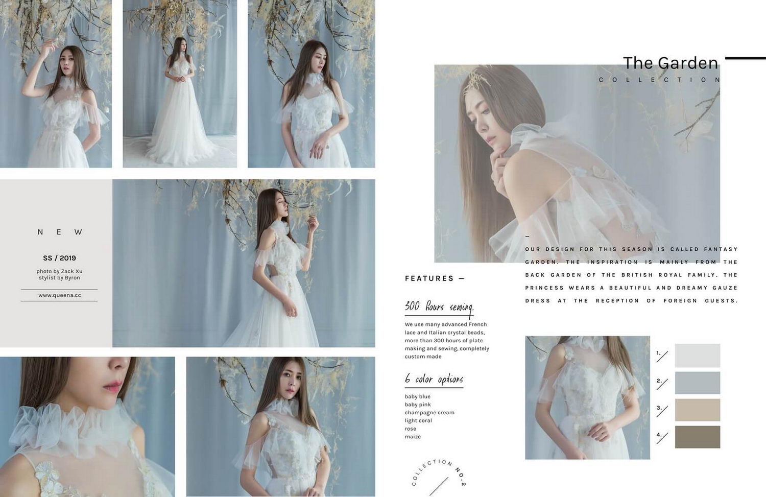 富察皇后的灰白色調,讓我們的設計團隊有了不同的想法!! 誰說婚紗一定要純白的呢? 以灰白色調為主,搭配大地色系,仿中古世紀復古造型設計,維多利亞高領與荷葉垂肩紗,打造出女神的飄逸仙氣~藍灰色調蕾絲混芽金色紗裙,夢幻的甜美氣質展露無遺! 來自昆娜的富察皇后,也是平易近人又甜美可愛!!