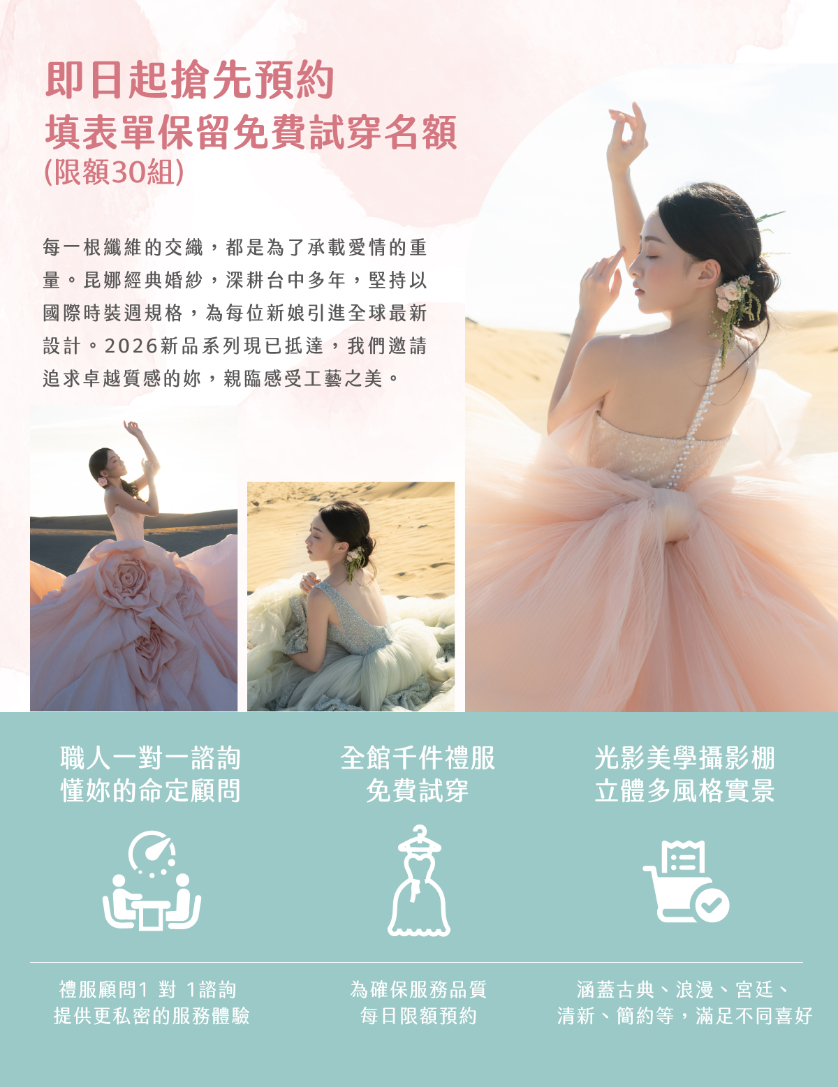 累積超過 20,000 對新人服務經驗,【昆娜婚紗】不只是 台中婚紗 的代名詞,更是許多人心中唯一的 台中婚紗推薦品牌。無論你偏好自然系、韓系、復古或時尚風格,我們都能以專業團隊為你捕捉最動人的愛情故事。