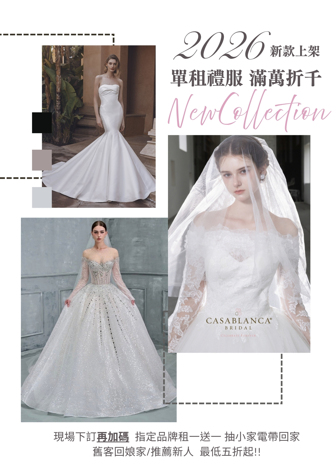 1. 單租禮服全館滿萬折千,現場下訂再享特別折扣,滿額加碼抽熱門小家電等60項大獎🎉