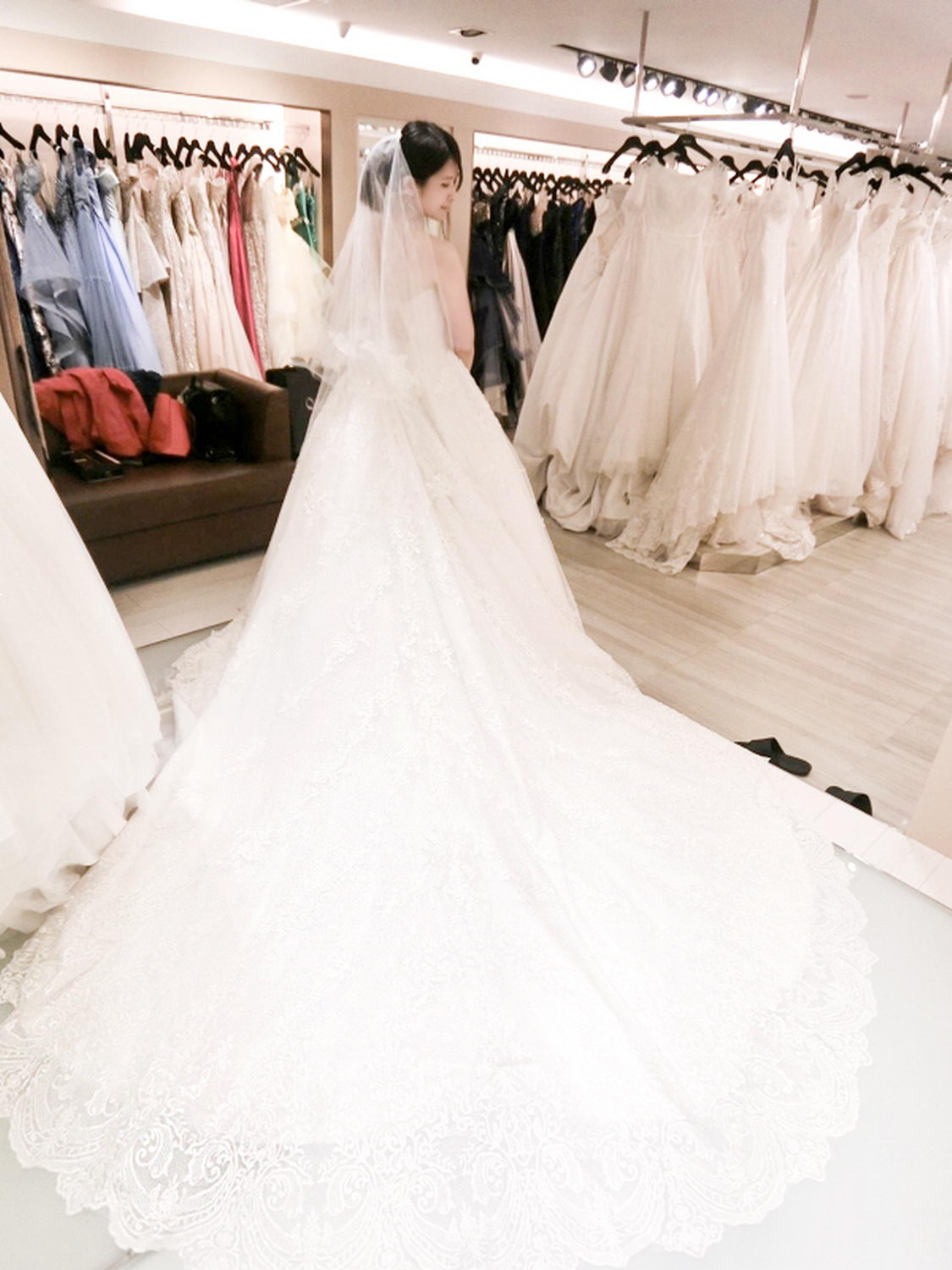 選擇禮服時,因為時間真的很緊湊,所以信任攝影師及禮秘的建議,禮秘也搭配身形及試穿時的需求幫忙找到心裡希望的禮服~